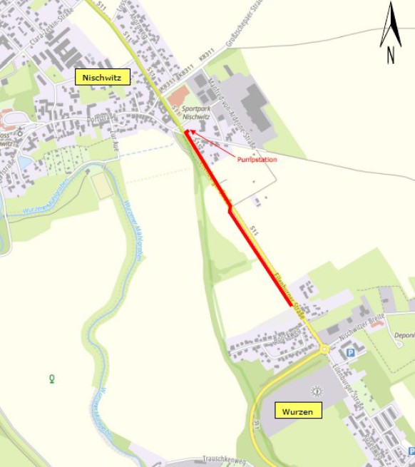 Der Planungsbereich umfasst im südlichen Bereich der Ortslage Nischwitz die Sanierung der vorhandenen Pumpstation und den Neubau der Schmutzwasserdruckleitung von Nischwitz nach Wurzen.